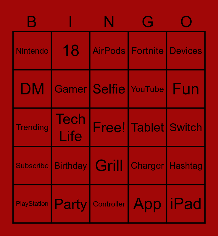 This bingo card has a free space and 55 words: Gaming, PlayStation, Xbox, Nintendo, Controller, Headset, Gamer, Streaming, YouTube, TikTok, Fortnite, Minecraft, Roblox, Discord, WiFi, Bluetooth, Devices, Tech Life, iPhone, iPad, Tablet, Laptop, Charger, AirPods, Screenshot, Selfie, App, FaceTime, Switch, Hashtag, Viral, Influencer, Followers, Emoji, DM, Trending, Meme, Subscribe, Like, Milestone, 18, Adulting, Level Up, Celebration, Birthday, Party, Family, Friends, Cake, Fun, Fish Fry, Fries, Cookout, Grill and Good Vibes.