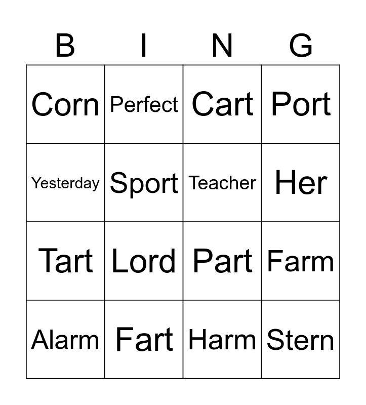 This bingo card has 28 words: Free!, Scarf, Tart, Star, Sport, Cart, Perfect, Stern, Fart, Start, Part, Port, Fort, Sort, Lord, Fork, Cork, Teacher, Her, Fern, Corn, Arm, Alarm, Farm, Harm, Sharp, Yesterday and Tern.