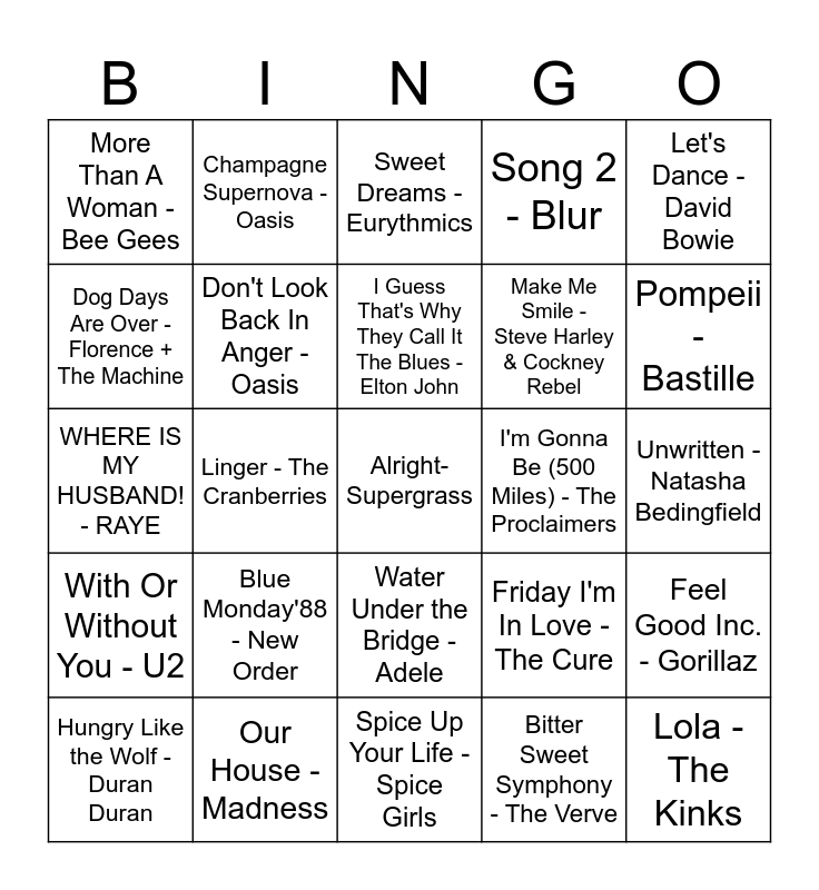 This bingo card has 53 words: (I Can't Get No) Satisfaction - The Rolling Stones, Alright- Supergrass, Another Brick in the Wall, Pt. 2 - Pink Floyd, Bitter Sweet Symphony - The Verve, Blue Monday'88 - New Order, Budapest - George Ezra, Champagne Supernova - Oasis, Creep - Radiohead, Dog Days Are Over - Florence + The Machine, Don't Let Me Down - The Beatles, Don't Look Back In Anger - Oasis, Everybody Wants To Rule The World - Tears For Fears, Feel Good Inc. - Gorillaz, Friday I'm In Love - The Cure, Galway Girl - Ed Sheeran, Hungry Like the Wolf - Duran Duran, I Guess That's Why They Call It The Blues - Elton John, I'm Gonna Be (500 Miles) - The Proclaimers, I'm Still Standing - Elton John, Let's Dance - David Bowie, Linger - The Cranberries, Lola - The Kinks, Make Me Smile - Steve Harley & Cockney Rebel, More Than A Woman - Bee Gees, Never Gonna Give You Up - Rick Astley, Our House - Madness, Owner of a Lonely Heart - Yes, Paper Planes - M.I.A., Pinball Wizard - The Who, Pompeii - Bastille, Put Your Records On - Corinne Bailey Rae, Red Red Wine - UB40, Rock DJ - Robbie Williams, Roxanne - The Police, Should I Stay or Should I Go - The Clash, Son Of A Preacher Man - Dusty Springfield, Song 2 - Blur, Spice Up Your Life - Spice Girls, Sweet Dreams - Eurythmics, Take Me Out - Franz Ferdinand, There She Goes - The La's, Under Pressure - Queen, David Bowie, Unwritten - Natasha Bedingfield, Viva La Vida - Coldplay, Wannabe - Spice Girls, Water Under the Bridge - Adele, We Will Rock You - Queen, West End Girl - Lily Allen, WHERE IS MY HUSBAND! - RAYE, With Or Without You - U2, You Really Got Me - The Kinks, You Spin Me Round (Like a Record) - Dead Or Alive and Zombie - The Cranberries.