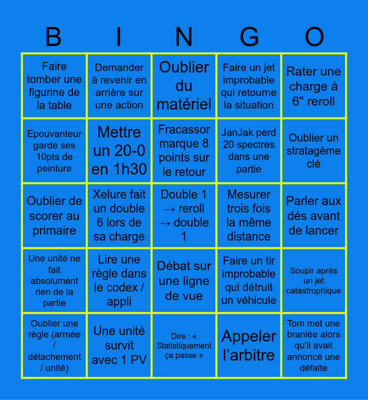 This bingo card has 45 words: Free!, Double 1 → reroll → double 1, Dire « Je n’ai pas de chance », Oublier une règle (armée / détachement / unité), Critique de la FEQ, Appeler l’arbitre, Oublier du matériel, Réussir une charge à 9", Rater une charge à 6" reroll, Une unité survit avec 1 PV, Faire un jet improbable qui retourne la situation, Mesurer trois fois la même distance, Débat sur une ligne de vue, Lire une règle dans le codex / appli, Dire : « C’est équilibré ça ? », Dire : « Statistiquement ça passe », Oublier un objectif secondaire, Oublier de scorer au primaire, Oublier une phase entière, Oublier un stratagème clé, Demander à revenir en arrière sur une action, Demander la portée exacte d’une arme, Se rendre compte d’un mauvais placement, Faire tomber une figurine de la table, Commenter les dés adverses, Parler aux dés avant de lancer, Discuter d’une règle obscure, Dire : "si ça passe je gagne la partie", Faire un tir improbable qui détruit un véhicule, Une unité ne fait absolument rien de la partie, Une unité survit toute la partie contre toute attente, Soupir après un jet catastrophique, Rire nerveux après un jet improbable, Dire : "c’est la dernière fois que je joue cette armée", Flo oublie de faire arriver une unité de réserve avant le T4, Xelure fait un double 6 lors de sa charge, Kouloss est clock, Loki laisse une unité à 1 pv, Tom met une branlée alors qu'il avait annoncé une défaite, Fracassor marque 8 points sur le retour, Epouvanteur garde ses 10pts de peinture, JanJak perd 20 spectres dans une partie, Négocier une case du bingo avec le coach, Mettre un 20-0 en 1h30 and Prendre un 20-0 en 1h30.