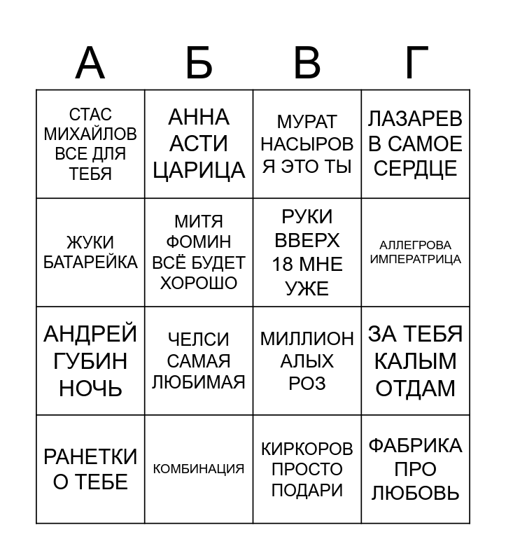 This bingo card has 24 words: МАКСИМ ЗНАЕШЬ ЛИ ТЫ, ЛЕПРИКОНСЫ ХАЛИ-ГАЛИ, АЛЛЕГРОВА ИМПЕРАТРИЦА, АХ, КАКАЯ ЖЕНЩИНА, ЖУКИ БАТАРЕЙКА, СТАС МИХАЙЛОВ ВСЕ ДЛЯ ТЕБЯ, МИТЯ ФОМИН ВСЁ БУДЕТ ХОРОШО, АННА АСТИ ЦАРИЦА, КОМБИНАЦИЯ, 2 КУСОЧЕКА КОЛБАСКИ, АНДРЕЙ ГУБИН НОЧЬ, МИЛЛИОН АЛЫХ РОЗ, ВИА ГРА ПОПЫТКА НОМЕР 5, НАДЕЖДА КАДЫШЕВА ВЕНОЧЕК, РУКИ ВВЕРХ 18 МНЕ УЖЕ, ЗВЕРИ ДОЖДИ ПИСТОЛЕТЫ, КИРКОРОВ ПРОСТО ПОДАРИ, МУРАТ НАСЫРОВ Я ЭТО ТЫ, ЧЕЛСИ САМАЯ ЛЮБИМАЯ, ЗА ТЕБЯ КАЛЫМ ОТДАМ, РАНЕТКИ О ТЕБЕ, ФАБРИКА ПРО ЛЮБОВЬ, ЛАЗАРЕВ В САМОЕ СЕРДЦЕ and АГУТИН НА СИРЕНЕВОЙ ЛУНЕ.