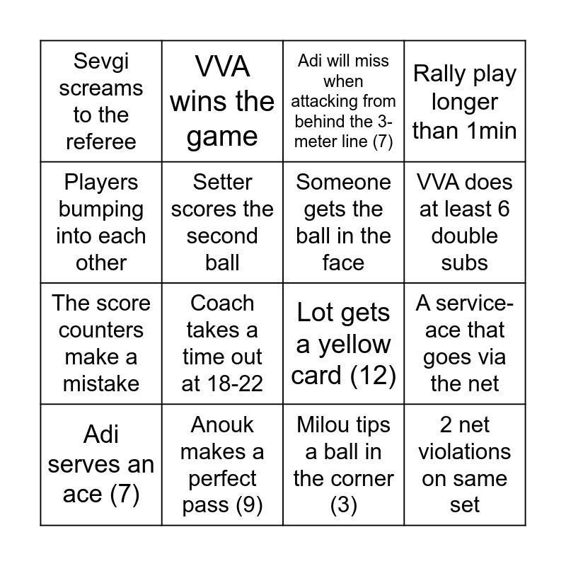 This bingo card has 16 words: Anouk makes a perfect pass (9), A service-ace that goes via the net, Adi will miss when attacking from behind the 3-meter line (7), Sevgi screams to the referee, The score counters make a mistake, VVA wins the game, Lot gets a yellow card (12), Milou tips a ball in the corner (3), Players bumping into each other, Setter scores the second ball, Adi serves an ace (7), Rally play longer than 1min, Coach takes a time out at 18-22, VVA does at least 6 double subs, Someone gets the ball in the face and 2 net violations on same set.