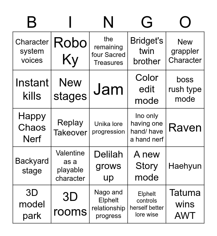 This bingo card has 25 words: Valentine as a playable character, Nago and Elphelt relationship progress, Jam, 3D model park, New grappler Character, Character system voices, Instant kills, Robo Ky, Ino only having one hand/ have a hand nerf, Delilah grows up, Color edit mode, Happy Chaos Nerf, A new Story mode, Haehyun, New stages, Tatuma wins AWT, Raven, the remaining four Sacred Treasures, boss rush type mode, Replay Takeover, Unika lore progression, 3D rooms, Backyard stage, Bridget's twin brother and Elphelt controls herself better lore wise.
