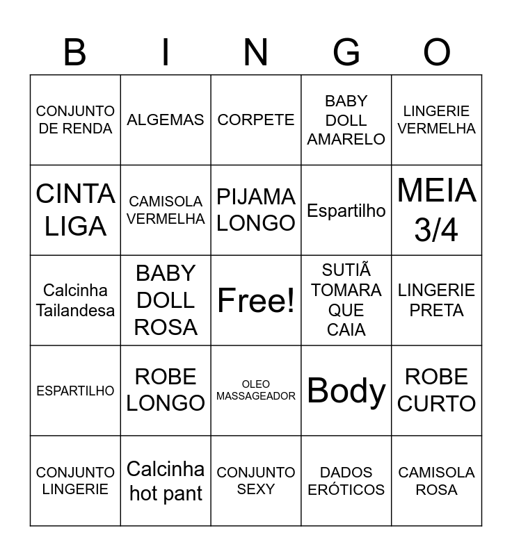 This bingo card has a free space and 37 words: CALCINHA NUDE, SUTIÃ BRANCO, FANTASIA DE ENFERMEIRA, CAMISOLA VERMELHA, ROBE CURTO, ROBE LONGO, PIJAMA LONGO, PIJAMA CURTO, LINGERIE VERMELHA, KIT TIAZINHA, BABY DOLL ROSA, BABY DOLL AMARELO, CAMISOLA ROSA, LINGERIE PRETA, CINTA LIGA, ESPARTILHO, MEIA CALÇA, CORPETE, OLEO MASSAGEADOR, SUTIÃ TOMARA QUE CAIA, CONJUNTO DE RENDA, MEIA 3/4, CONJUNTO LINGERIE, CONJUNTO SEXY, CALCINHA FIO DENTAL, DADOS ERÓTICOS, ALGEMAS, FANTASIAS, CALCINHA COMESTIVEL, GEL MASSAGEADOR, Calcinha Tanga, Calcinha hot pant, Calcinha Tailandesa, Sutiã, Body, Espartilho and Corselet.