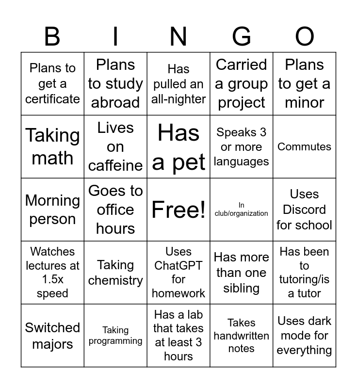 This bingo card has a free space and 24 words: Taking chemistry, Taking programming, Has a pet, Switched majors, Plans to get a minor, Plans to get a certificate, Taking math, Plans to study abroad, In club/organization, Uses ChatGPT for homework, Speaks 3 or more languages, Morning person, Has more than one sibling, Has been to tutoring/is a tutor, Lives on caffeine, Takes handwritten notes, Uses Discord for school, Has pulled an all-nighter, Commutes, Goes to office hours, Uses dark mode for everything, Watches lectures at 1.5x speed, Carried a group project and Has a lab that takes at least 3 hours.