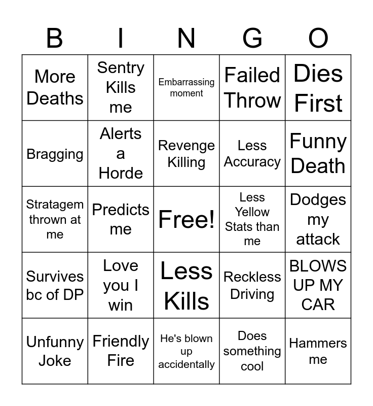 This bingo card has a free space and 24 words: Love you I win, Friendly Fire, Revenge Killing, Unfunny Joke, Dies First, More Deaths, Bragging, Sentry Kills me, Less Yellow Stats than me, Less Kills, Less Accuracy, Stratagem thrown at me, Reckless Driving, BLOWS UP MY CAR, Alerts a Horde, Does something cool, Dodges my attack, Embarrassing moment, Funny Death, Predicts me, Hammers me, Survives bc of DP, Failed Throw and He's blown up accidentally.