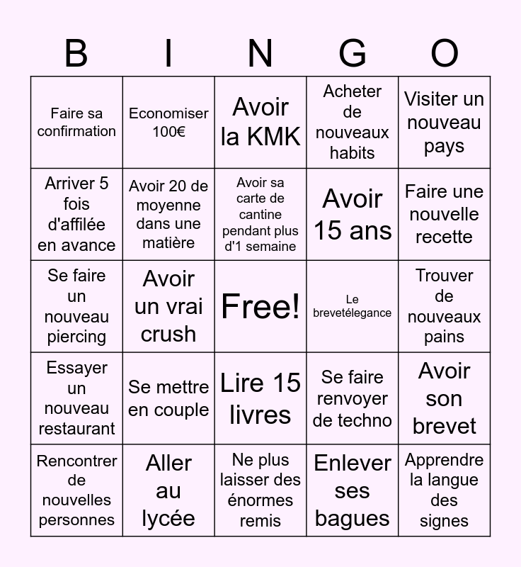 This bingo card has a free space and 24 words: Se mettre en couple, Aller au lycée, Avoir sa carte de cantine pendant plus d'1 semaine, Rencontrer de nouvelles personnes, Visiter un nouveau pays, Faire sa confirmation, Arriver 5 fois d'affilée en avance, Economiser 100€, Le brevetélegance, Lire 15 livres, Avoir 15 ans, Se faire un nouveau piercing, Se faire renvoyer de techno, Avoir son brevet, Avoir 20 de moyenne dans une matière, Enlever ses bagues, Trouver de nouveaux pains, Avoir la KMK, Faire une nouvelle recette, Avoir un vrai crush, Apprendre la langue des signes, Essayer un nouveau restaurant, Acheter de nouveaux habits and Ne plus laisser des énormes remis.
