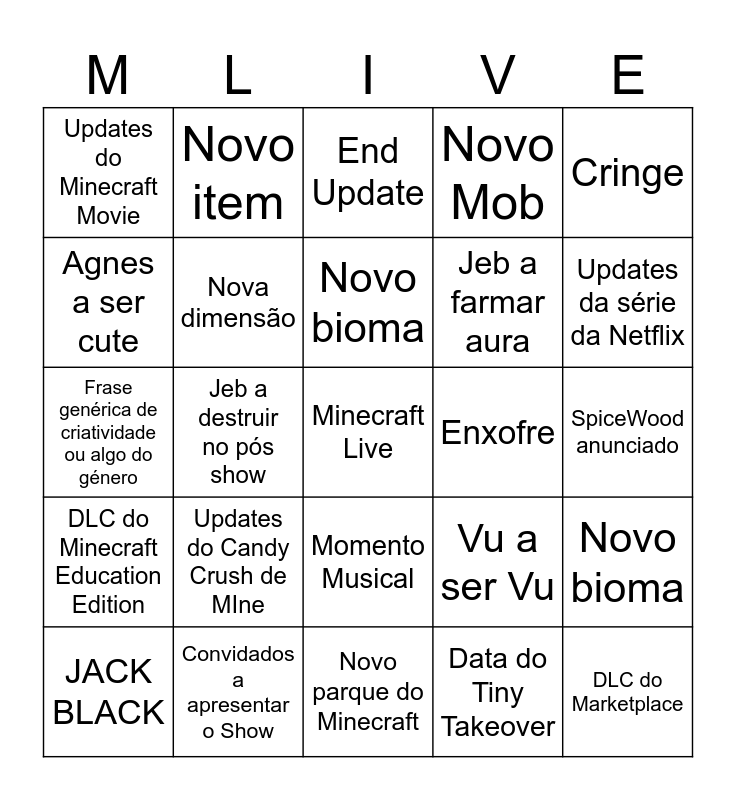 This bingo card has a free space and 24 words: Updates do Candy Crush de MIne, Convidados a apresentar o Show, Novo bioma, JACK BLACK, Cringe, Updates do Minecraft Movie, Agnes a ser cute, Novo item, Enxofre, Momento Musical, Jeb a farmar aura, Frase genérica de criatividade ou algo do género, Vu a ser Vu, Novo bioma, Nova dimensão, Data do Tiny Takeover, SpiceWood anunciado, End Update, Updates da série da Netflix, Jeb a destruir no pós show, DLC do Marketplace, DLC do Minecraft Education Edition, Novo Mob and Novo parque do Minecraft.