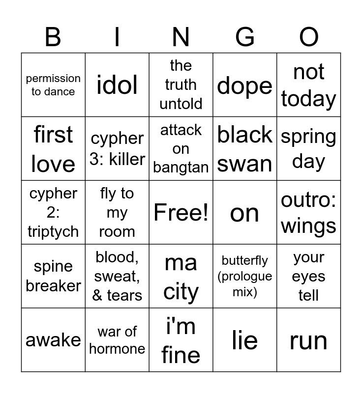 This bingo card has a free space and 24 words: blood, sweat, & tears, war of hormone, attack on bangtan, awake, not today, permission to dance, first love, idol, on, ma city, black swan, cypher 2: triptych, butterfly (prologue mix), your eyes tell, cypher 3: killer, lie, outro: wings, the truth untold, spring day, fly to my room, run, spine breaker, dope and i'm fine.
