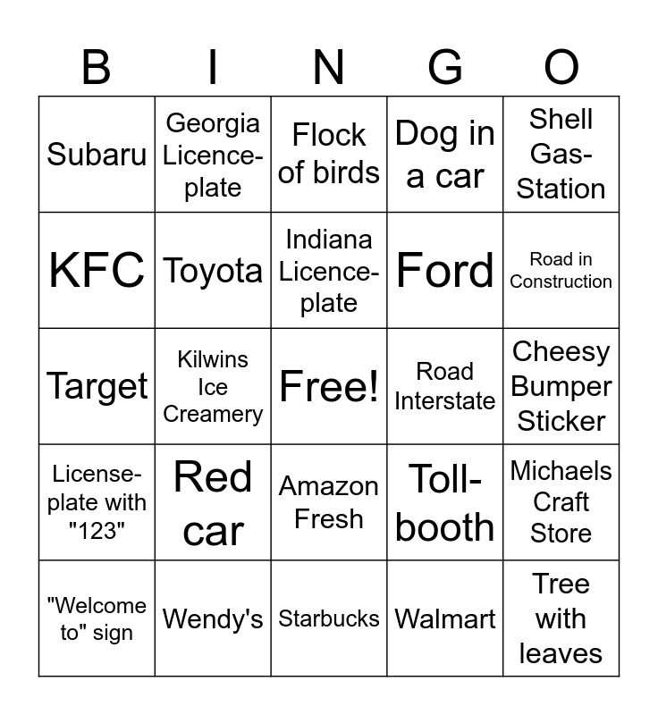 This bingo card has a free space and 24 words: Red car, Wendy's, Indiana Licence-plate, "Welcome to" sign, Shell Gas-Station, Subaru, KFC, Georgia Licence-plate, Road Interstate, Amazon Fresh, Ford, Target, Toll-booth, Michaels Craft Store, Toyota, Walmart, Cheesy Bumper Sticker, Flock of birds, Road in Construction, Kilwins Ice Creamery, Tree with leaves, License-plate with "123", Dog in a car and Starbucks.