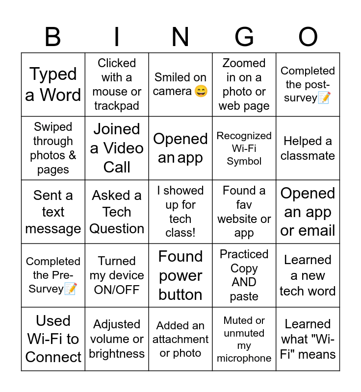This bingo card has a free space and 24 words: Turned my device ON/OFF, Adjusted volume or brightness, Opened an app, Used Wi-Fi to Connect, Completed the post-survey📝, Typed a Word, Swiped through photos & pages, Clicked with a mouse or trackpad, Found a fav website or app, Found power button, Recognized Wi-Fi Symbol, Sent a text message, Practiced Copy AND paste, Learned a new tech word, Joined a Video Call, Muted or unmuted my microphone, Opened an app or email, Smiled on camera 😄, Helped a classmate, Asked a Tech Question, Learned what "Wi-Fi" means, Completed the Pre-Survey📝, Zoomed in on a photo or web page and Added an attachment or photo.