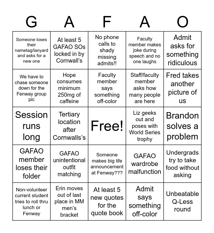 This bingo card has a free space and 24 words: GAFAO unintentional outfit matching, Erin moves out of last place in MM men’s bracket, Faculty member says something off-color, Non-volunteer current student tries to roll thru lunch or Fenway, Admit asks for something ridiculous, Someone loses their nametag/lanyard and asks for a new one, We have to chase someone down for the Fenway group pic, At least 5 GAFAO SOs locked in by Cornwall’s, Liz geeks out and poses with World Series trophy, Someone makes big life announcement at Fenway???, Staff/faculty member asks how many people are here, Session runs long, GAFAO wardrobe malfunction, Undergrads try to take food without asking, Hope consumes minimum 250mg of caffeine, Admit says something off-color, Brandon solves a problem, No phone calls to shady missing admits!!, Fred takes another picture of us, Tertiary location after Cornwalls’s, Unbeatable Q-Less round, GAFAO member loses their folder, Faculty member makes joke during speech and no one laughs and At least 5 new quotes for the quote book.