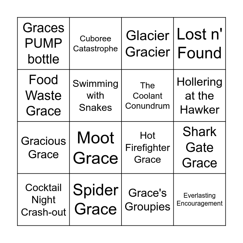 This bingo card has 17 words: Grace's Groupies, Cocktail Night Crash-out, Glacier Gracier, Graces PUMP bottle, Moot Grace, Lost n' Found, Shark Gate Grace, The Coolant Conundrum, Hollering at the Hawker, Swimming with Snakes, Spider Grace, Hot Firefighter Grace, Food Waste Grace, Cuboree Catastrophe, Gracious Grace, Canberra Calamity and Everlasting Encouragement.