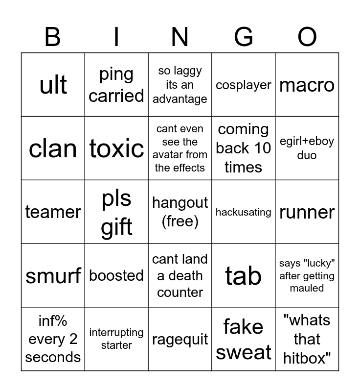 This bingo card has a free space and 24 words: boosted, interrupting starter, cant even see the avatar from the effects, inf% every 2 seconds, macro, ult, clan, ping carried, hackusating, cant land a death counter, coming back 10 times, teamer, tab, says "lucky" after getting mauled, toxic, fake sweat, runner, so laggy its an advantage, egirl+eboy duo, pls gift, "whats that hitbox", smurf, cosplayer and ragequit.
