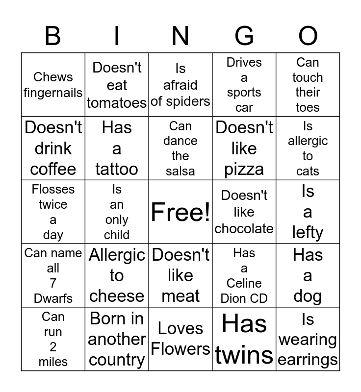 This bingo card has a free space and 24 words: Allergic to cheese, Born in another country, Can dance the salsa, Can run 2 miles, Can touch their toes, Chews fingernails, Doesn't drink coffee, Doesn't eat tomatoes, Doesn't like chocolate, Doesn't like meat, Doesn't like pizza, Flosses twice a day, Has a Celine Dion CD, Has a dog, Has a tattoo, Has twins, Is a lefty, Is afraid of spiders, Is allergic to cats, Is an only child, Is wearing earrings, Can name all 7 Dwarfs, Drives a sports car and Loves Flowers.