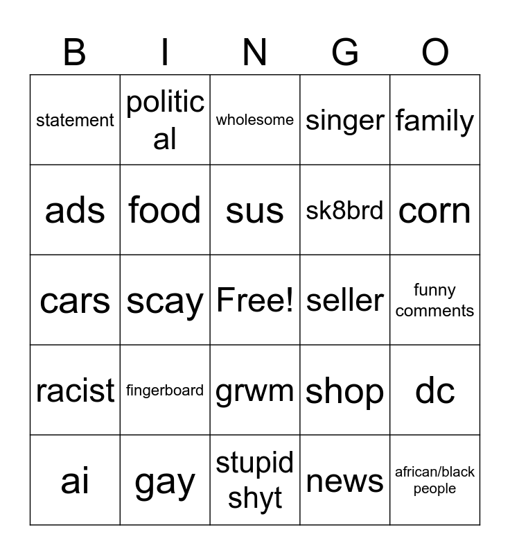 This bingo card has a free space and 24 words: fingerboard, gay, sus, ai, family, statement, ads, politic al, seller, grwm, sk8brd, cars, shop, dc, food, news, funny comments, wholesome, corn, scay, african/black people, racist, singer and stupid shyt.
