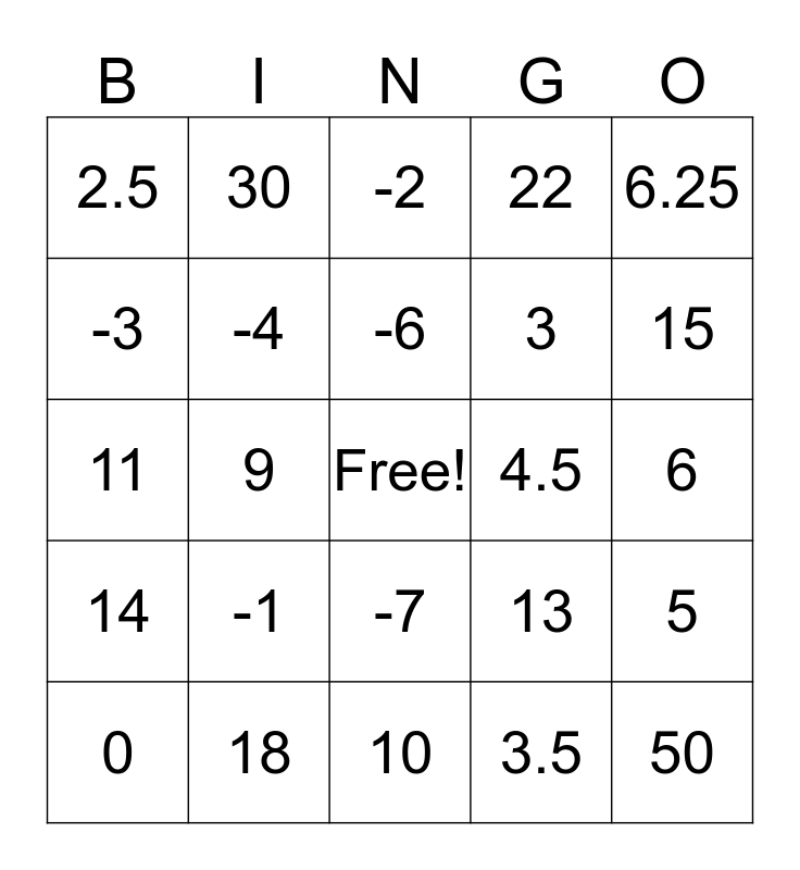 This bingo card has a free space and 24 words: -1, 18, -6, 0, 6.25, 2.5, -3, 30, 4.5, -7, 3, 11, 13, 5, -4, 3.5, 6, -2, 15, 9, 50, 14, 22 and 10.