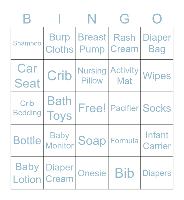 This bingo card has a free space and 24 words: Baby Monitor, Diaper Cream, Nursing Pillow, Baby Lotion, Diaper Bag, Shampoo, Car Seat, Burp Cloths, Pacifier, Soap, Activity Mat, Crib Bedding, Formula, Infant Carrier, Crib, Bib, Socks, Breast Pump, Wipes, Bath Toys, Diapers, Bottle, Rash Cream and Onesie.
