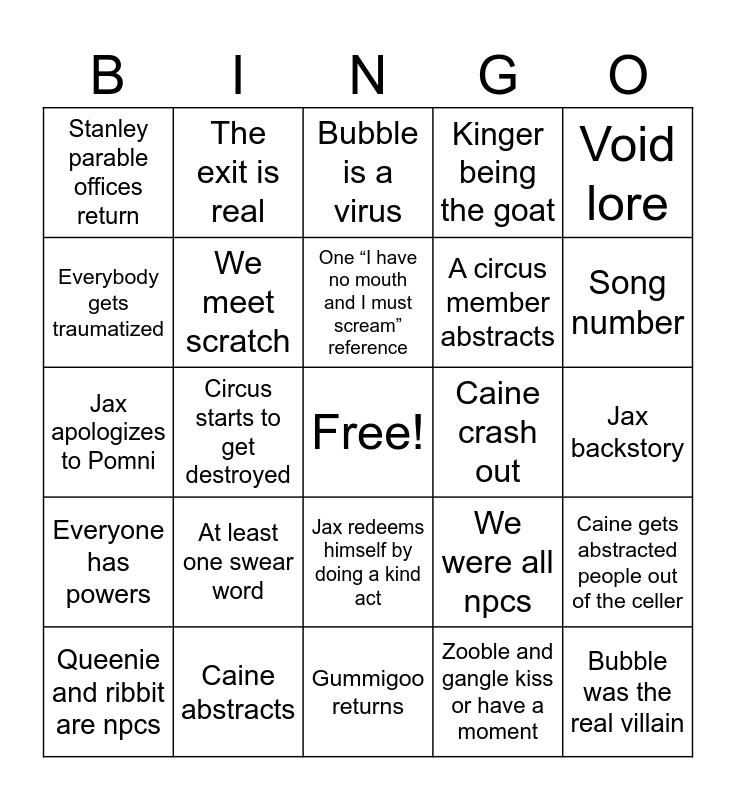 This bingo card has a free space and 24 words: At least one swear word, Caine abstracts, One “I have no mouth and I must scream” reference, Queenie and ribbit are npcs, Void lore, Stanley parable offices return, Everybody gets traumatized, The exit is real, Caine crash out, Jax redeems himself by doing a kind act, A circus member abstracts, Jax apologizes to Pomni, We were all npcs, Caine gets abstracted people out of the celler, We meet scratch, Zooble and gangle kiss or have a moment, Jax backstory, Bubble is a virus, Song number, Circus starts to get destroyed, Bubble was the real villain, Everyone has powers, Kinger being the goat and Gummigoo returns.