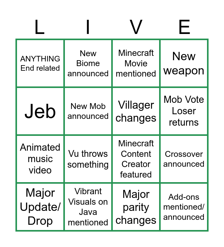 This bingo card has 23 words: Add-ons mentioned/ announced, New block announced, Mob Vote Loser returns, Another spinoff/ Dungeons 2, Jeb, ANYTHING End related, New Mob announced, New Biome announced, Major Update/ Drop, a meme is referenced in any capacity, Vu throws something, Animated music video, Nether Content, Under half an hour, Vibrant Visuals on Java mentioned, ANYTHING combat related, Minecraft Movie mentioned, Minecraft Content Creator featured, Villager changes, Crossover announced, New weapon, Major parity changes and Longterm Initiative (like vibrant visuals).