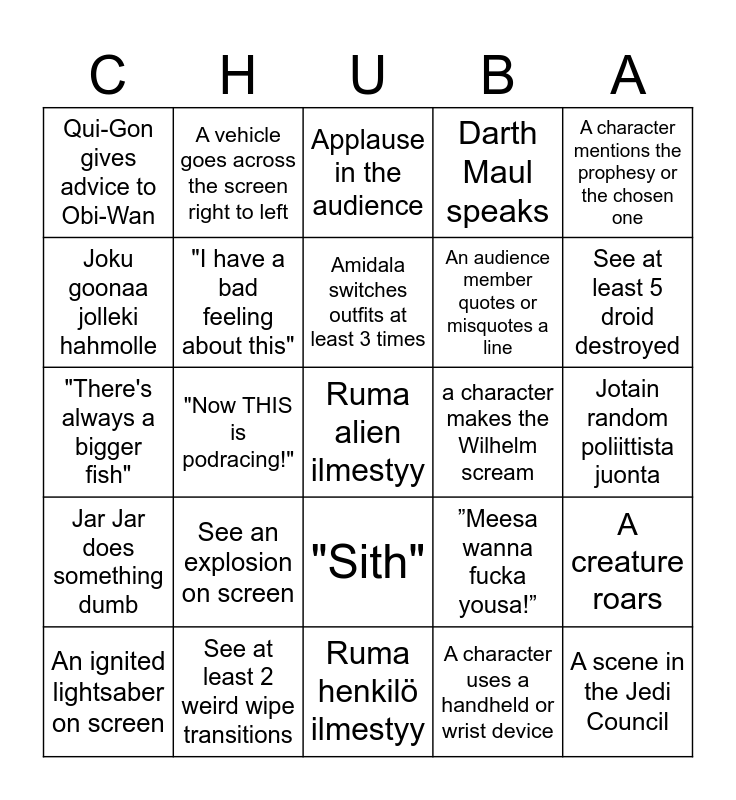 This bingo card has a free space and 27 words: ”Meesa wanna fucka yousa!”, "Roger Roger", An audience member quotes or misquotes a line, Ruma henkilö ilmestyy, Joku goonaa jolleki hahmolle, Applause in the audience, A vehicle goes across the screen right to left, Jar Jar does something dumb, a character makes the Wilhelm scream, A creature roars, "There's always a bigger fish", Darth Maul speaks, An ignited lightsaber on screen, See at least 2 weird wipe transitions, See at least 5 droid destroyed, Darth Maul moggaa, "I have a bad feeling about this", Amidala switches outfits at least 3 times, See an explosion on screen, Qui-Gon gives advice to Obi-Wan, Jotain random poliittista juonta, A character uses a handheld or wrist device, "Now THIS is podracing!", A scene in the Jedi Council, "Sith", A character mentions the prophesy or the chosen one and A character speaks an alien language.