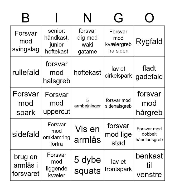 This bingo card has 40 words: benkast, Forsvar mod spark, Forsvar mod trøjegreb, forsvar mod halsgreb, Forsvar mod liggende kvæler, Vis en armlås, hoftekast, Forsvar dig med et benkast, Rygfald, sidefald, Forsvar mod uppercut, Forsvar mod kvælergreb fra siden, 5 armbøjninger, forsvar mod hårgreb, forsvar mod sidehalsgreb, Forsvar mod omklamring forfra, forsvar mod omklamring bagfra, Forsvar mod svingslag, Forsvar mod kvælergreb forfra, forsvar dig med waki gatame, Forsvar mod dobbelt håndledsgreb, lav et frontspark, lav et cirkelspark, rullefald, Forsvar mod slag fra oven, forsvar mod enkelt håndledsgreb, forsvar mod knivstik, forsvar mod tilfældigt angreb - uke vælger, benkast til venstre, hoftekast til venstre, forsvar mod genstand, brug en armlås i forsvaret, forsvar dig med hoftekast, forsvar mod lige stød, fladt gadefald, 5 dybe squats, 5 sit-ups, forsvar dig med hovedskruning, senior: håndkast, junior hoftekast and Senior: liggende kast som forsvar Junior benkast som forsvar.