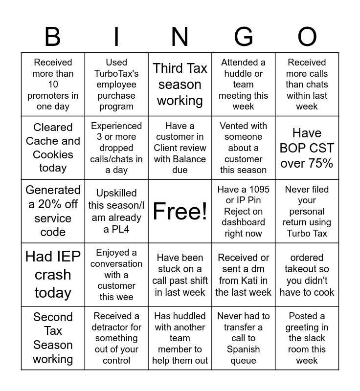 This bingo card has a free space and 34 words: Spent more than an hour in a huddle with a Lead, Never had to transfer a call to Spanish queue, First tax season working, Received more than 10 surveys in one week, Had IEP crash today, Experienced 3 or more dropped calls/chats in a day, Received more calls than chats within last week, Second Tax Season working, Used TurboTax's employee purchase program, Had to call Help Desk this month, Have a customer in Client review with Balance due, Third Tax season working, More than 5 TNPS surveys in March, worked w/ a Lead this week, Have a 1095 or IP Pin Reject on dashboard right now, Have BOP CST over 75%, Received a detractor for something out of your control, Generated a 20% off service code, Enjoyed a conversation with a customer this wee, Received or sent a dm from Kati in the last week, Have been stuck on a call past shift in last week, Finished 5 returns this week, Received more than 10 promoters in one day, Never filed your personal return using Turbo Tax, Has huddled with another team member to help them out, Posted a greeting in the slack room this week, Attended a huddle or team meeting this week, Attended Expert Social this season, Vented with someone about a customer this season, Cleared Cache and Cookies today, Opened TurboTax Desktop this week, Upskilled this season/I am already a PL4, ordered takeout so you didn't have to cook and Did not say something sarcastic to the customer when you wanted to.