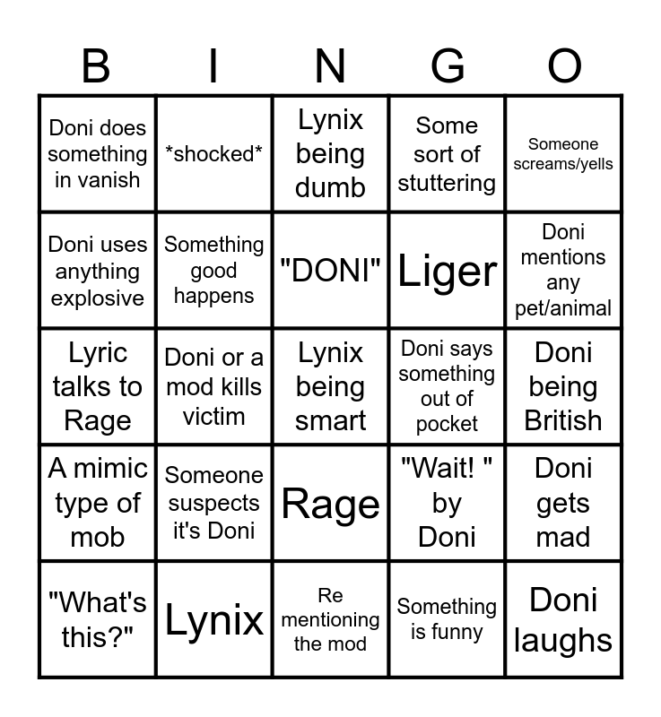 This bingo card has a free space and 24 words: Someone suspects it's Doni, Lynix, "DONI", "What's this?", Someone screams/yells, Doni does something in vanish, Doni uses anything explosive, *shocked*, Doni says something out of pocket, Rage, Liger, Lyric talks to Rage, "Wait! " by Doni, Doni gets mad, Something good happens, Something is funny, Doni being British, Lynix being dumb, Doni mentions any pet/animal, Doni or a mod kills victim, Doni laughs, A mimic type of mob, Some sort of stuttering and Re mentioning the mod.