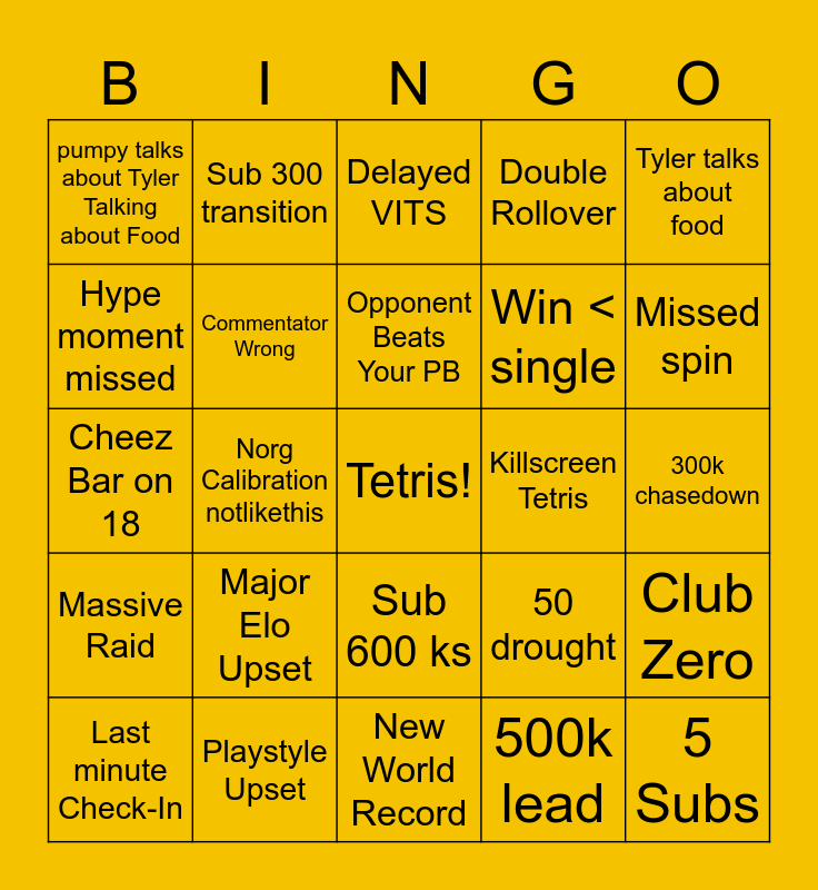 This bingo card has a free space and 24 words: Major Elo Upset, Playstyle Upset, Opponent Beats Your PB, Last minute Check-In, Tyler talks about food, pumpy talks about Tyler Talking about Food, Hype moment missed, Sub 300 transition, Killscreen Tetris, Sub 600 ks, Win < single, Cheez Bar on 18, 50 drought, Club Zero, Commentator Wrong, 500k lead, 300k chasedown, Delayed VITS, Missed spin, Norg Calibration notlikethis, 5 Subs, Massive Raid, Double Rollover and New World Record.