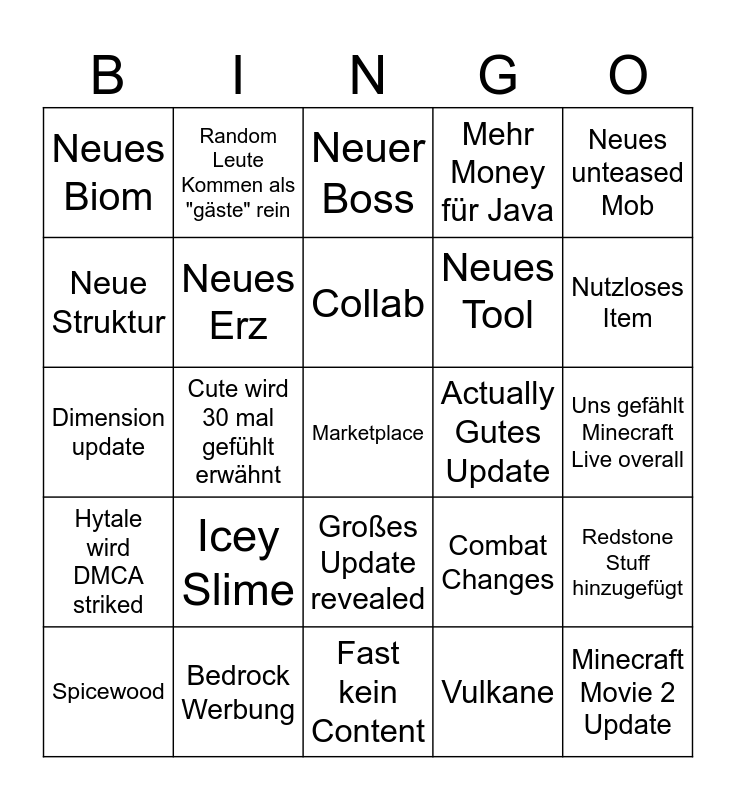 This bingo card has a free space and 24 words: Icey Slime, Bedrock Werbung, Collab, Spicewood, Neues unteased Mob, Neues Biom, Neue Struktur, Random Leute Kommen als "gäste" rein, Actually Gutes Update, Großes Update revealed, Neues Tool, Dimension update, Combat Changes, Redstone Stuff hinzugefügt, Neues Erz, Vulkane, Uns gefählt Minecraft Live overall, Neuer Boss, Nutzloses Item, Cute wird 30 mal gefühlt erwähnt, Minecraft Movie 2 Update, Hytale wird DMCA striked, Mehr Money für Java and Fast kein Content.