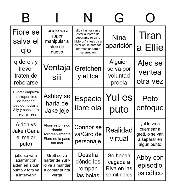This bingo card has a free space and 24 words: Algún reto físico donde sorpresivamente Fiore no la pase tan mal, Grett se va hartar de Yul y lo va a mandar a comer purita verga, Gretchen y el tca, jake se va a agarrar con aiden en algún punto y tom va a intervenir, Tiran a Ellie, Fiore se salva el qlo, q derek y trevor traten de rebelarse, fiore lo va a super manipular a alec de nuevo, Yul es puto, Connor se va/Giro de personaje, Alguien se va por voluntad propia, Hunter empieza a arrepentirse de haberle pedido noviar a Ally y considera mejor a Tess, Realidad virtual, yul la va a cuernear a grett, o se van a separar en algún punto, Ventaja siii, Se hacen cagada a Riya en las semifinales, Poto enfoque, ally y hunter van a estar al borde de separarse (o ya lo hicieron) y tess va a estar ahí intentando intermediar para q se arreglen, Alec se ventea otra vez, Ashley se harta de Jake jeje, Abby con episodio psicótico, Aiden vs Jake (Gana el mejor puto), Nina aparición and Desafía dónde les rompan las bolas.
