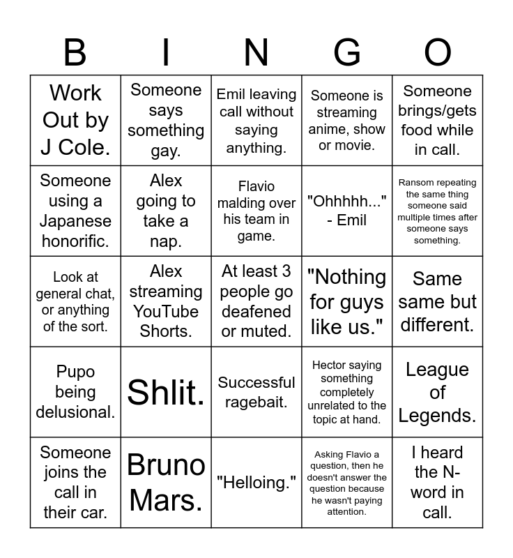 This bingo card has 25 words: Pupo being delusional., Bruno Mars., At least 3 people go deafened or muted., Asking Flavio a question, then he doesn't answer the question because he wasn't paying attention., Someone brings/gets food while in call., Work Out by J Cole., Someone says something gay., Emil leaving call without saying anything., "Nothing for guys like us.", League of Legends., Someone using a Japanese honorific., Alex going to take a nap., "Helloing.", Hector saying something completely unrelated to the topic at hand., Ransom repeating the same thing someone said multiple times after someone says something., Someone joins the call in their car., Alex streaming YouTube Shorts., Flavio malding over his team in game., "Ohhhhh..." - Emil, Same same but different., Look at general chat, or anything of the sort., Shlit., Successful ragebait., Someone is streaming anime, show or movie. and I heard the N-word in call..