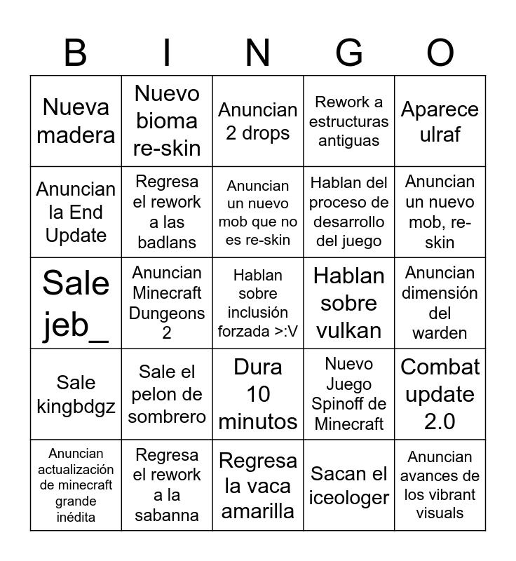 This bingo card has a free space and 24 words: Sale el pelon de sombrero, Regresa el rework a la sabanna, Anuncian un nuevo mob que no es re-skin, Anuncian actualización de minecraft grande inédita, Aparece ulraf, Nueva madera, Anuncian la End Update, Nuevo bioma re-skin, Hablan sobre vulkan, Dura 10 minutos, Hablan del proceso de desarrollo del juego, Sale jeb_, Nuevo Juego Spinoff de Minecraft, Combat update 2.0, Regresa el rework a las badlans, Sacan el iceologer, Anuncian dimensión del warden, Anuncian 2 drops, Anuncian un nuevo mob, re-skin, Anuncian Minecraft Dungeons 2, Anuncian avances de los vibrant visuals, Sale kingbdgz, Rework a estructuras antiguas and Regresa la vaca amarilla.