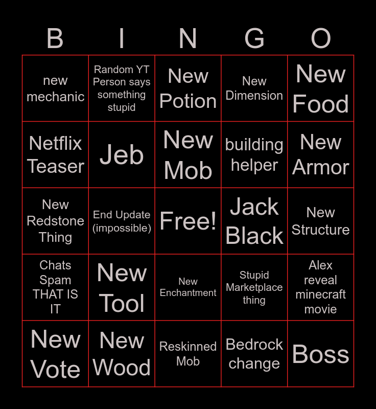 This bingo card has a free space and 24 words: New Tool, New Wood, New Mob, New Vote, New Food, new mechanic, Netflix Teaser, Random YT Person says something stupid, Jack Black, New Enchantment, building helper, New Redstone Thing, Stupid Marketplace thing, Alex reveal minecraft movie, Jeb, Bedrock change, New Structure, New Potion, New Armor, End Update (impossible), Boss, Chats Spam THAT IS IT, New Dimension and Reskinned Mob.
