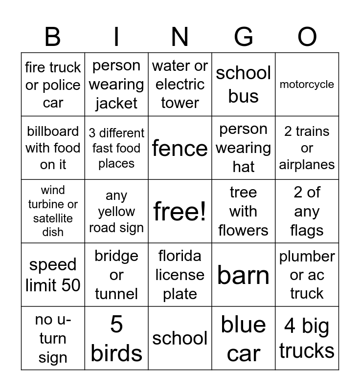 This bingo card has a free space and 30 words: 5 birds, river or lake, any yellow road sign, rest area, fire truck or police car, water or electric tower, 3 different fast food places, florida license plate, tree with flowers, school, 2 of any flags, 4 big trucks, blue car, red car, 2 trains or airplanes, wild animal, barn, speed limit 50, bridge or tunnel, motorcycle, wind turbine or satellite dish, green arrow light, person wearing jacket, person wearing hat, billboard with food on it, school bus, plumber or ac truck, no u-turn sign, fence and 5 traffic cones.