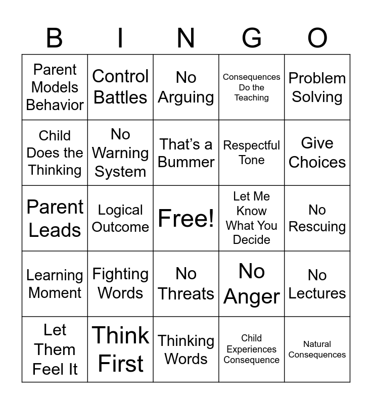 This bingo card has a free space and 50 words: Empathy, Natural Consequences, Imposed Consequences, Thinking Words, Fighting Words, Choices Within Limits, Control Battles, Ownership of the Problem, Child Does the Thinking, Parent Stays Calm, No Warning System, Consequences Do the Teaching, No Lectures, No Anger, Delay the Consequence, Enforceable Statement, That’s a Bummer, Let Me Know What You Decide, Responsibility, Problem Solving, Logical Outcome, Child Experiences Consequence, Parent Models Behavior, Respectful Tone, Self-Control, Stay Calm, Give Choices, Let Them Decide, No Arguing, No Threats, No “I Told You So”, Stay Neutral, Let Them Learn, Natural Outcome, Think First, Child Responsibility, Parent Controls Self, Quiet Voice, Kind Words, No Rescuing, Wait Before Reacting, Follow Through, Simple Choices, Calm Consequence, Let Them Feel It, Parent Leads, No Power Struggle, Respect, Learning Moment and Stay Consisten.