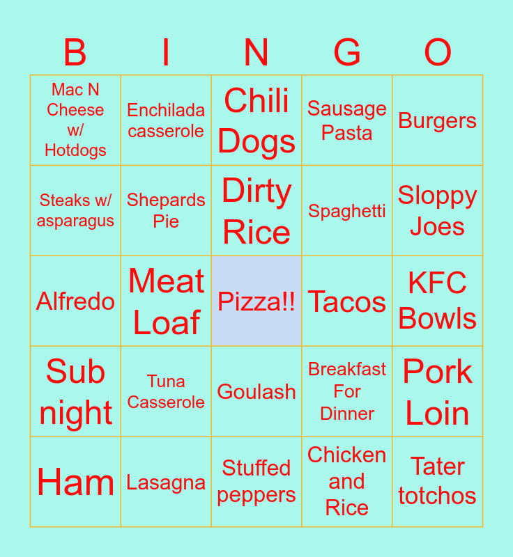 This bingo card has a free space and 24 words: Tuna Casserole, Lasagna, Dirty Rice, Ham, Burgers, Mac N Cheese w/ Hotdogs, Steaks w/ asparagus, Enchilada casserole, Tacos, Goulash, Spaghetti, Alfredo, Breakfast For Dinner, Pork Loin, Shepards Pie, Chicken and Rice, KFC Bowls, Chili Dogs, Sloppy Joes, Meat Loaf, Tater totchos, Sub night, Sausage Pasta and Stuffed peppers.