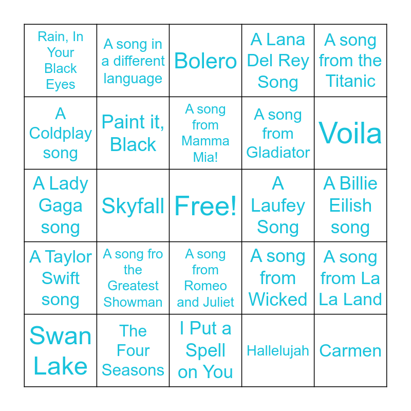 This bingo card has a free space and 29 words: Swan Lake, A Song from Dune, Skyfall, A song from Moulin Rouge, Rain, In Your Black Eyes, Bolero, Paint it, Black, A song fro the Greatest Showman, A Laufey Song, The Four Seasons, A Billie Eilish song, Carmen, I Put a Spell on You, Hallelujah, Voila, Pirates of the Caribbean, A song from Romeo and Juliet, A Taylor Swift song, A song from the Titanic, A Lady Gaga song, A song from Wicked, A song from the Lion King, A song from Gladiator, A Coldplay song, A Lana Del Rey Song, A song in a different language, A song from La La Land, A song from Mamma Mia! and Somewhere Only We Know.