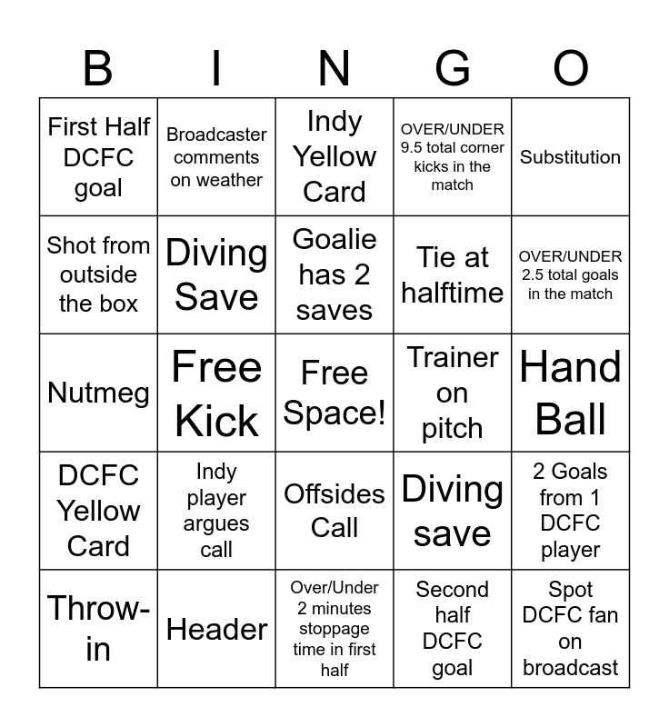 This bingo card has a free space and 30 words: Header, Player helps another player up, Free Kick, Shot inside the box, First Half DCFC goal, Indy Yellow Card, Diving Save, Offsides Call, Trainer on pitch, Over/Under 2 minutes stoppage time in first half, Hand Ball, Spot DCFC fan on broadcast, Second half DCFC goal, Slide Tackle, OVER/UNDER 2.5 total goals in the match, Shot hits crossbar, Diving save, DCFC Yellow Card, Indy player argues call, Substitution, Nutmeg, Jump Celebration, Broadcaster comments on weather, Tie at halftime, Shot from outside the box, OVER/UNDER 9.5 total corner kicks in the match, 2 Goals from 1 DCFC player, Throw-in, Goalie has 2 saves and Penalty Kick.