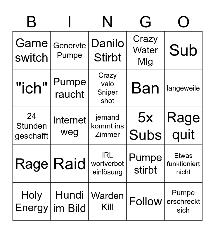 This bingo card has 25 words: Raid, Warden Kill, Crazy valo Sniper shot, Holy Energy, Sub, Game switch, "ich", Genervte Pumpe, 5x Subs, IRL wortverbot einlösung, Ban, 24 Stunden geschafft, Pumpe stirbt, Etwas funktioniert nicht, Pumpe raucht, Pumpe erschreckt sich, Rage quit, Danilo Stirbt, langeweile, Internet weg, jemand kommt ins Zimmer, Hundi im Bild, Rage, Crazy Water Mlg and Follow.