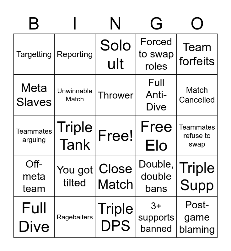 This bingo card has a free space and 24 words: You got tilted, Ragebaiters, Thrower, Full Dive, Team forfeits, Targetting, Meta Slaves, Reporting, Free Elo, Close Match, Full Anti-Dive, Teammates arguing, Double, double bans, Triple Supp, Unwinnable Match, 3+ supports banned, Teammates refuse to swap, Solo ult, Match Cancelled, Triple Tank, Post-game blaming, Off-meta team, Forced to swap roles and Triple DPS.