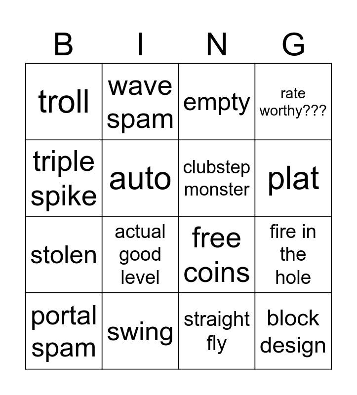 This bingo card has 16 words: swing, fire in the hole, empty, troll, stolen, wave spam, free coins, straight fly, triple spike, auto, portal spam, rate worthy???, actual good level, plat, clubstep monster and block design.