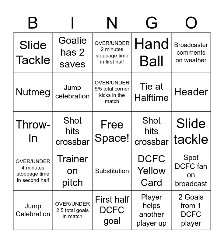 This bingo card has a free space and 31 words: First half DCFC goal, Free Kick, Shot hits crossbar, Indy Yellow Card, Slide Tackle, OVER/UNDER 2 minutes stoppage time in first half, Jump celebration, DCFC Yellow Card, Shot hits crossbar, Player helps another player up, Slide tackle, 2 Goals from 1 DCFC player, Penalty Kick, Indy player argues call, Header, Offsides call, Spot DCFC fan on broadcast, Trainer on pitch, OVER/UNDER 4 minutes stoppage time in second half, Substitution, Broadcaster comments on weather, Diving Save, Jump Celebration, Goalie has 2 saves, Tie at Halftime, Nutmeg, Hand Ball, Throw-In, OVER/UNDER 2.5 total goals in match, OVER/UNDER 9/5 total corner kicks in the match and Second half DCFC goal.
