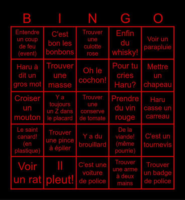 This bingo card has 45 words: Trouver une arme contendante courte, Trouver une conserve de tomate, Avoir un accident de voiture, Voir un rat, Lire un magazine 18+, Trouver une arme à deux mains, Trouver une culotte rose, Trouver un fruit (même pourri), Voir un parapluie, Il pleut!, Enfin du whisky!, Prendre du vin rouge, Y a du brouillard, Trouver une pince à épiler, Manger du café, C'est une voiture de police, Trouver des munitions 9mm, Croiser un mouton, Voir un cheval, Mettre un chapeau, C'est bon les bonbons, Trouver une voiture qui roule, Entendre un cri (event), Entendre un coup de feu (event), Haru passe par une fenêtre, Haru casse un carreau, Oh des Chips!, Trouver une conserve de soupe de champignons, De la viande! (même pourrie), Le saint canard!(en plastique), Porter un sac, C'est un tournevis, Complètement Marteau!, +1 dans une compétence, Vive le chocolat!, Y a toujours un Z dans le placard, Le masque de Jason, Trouver une écharpe, Trouver un badge de police, Oh le cochon!, Haru à dit un gros mot, Pour tu cries Haru?, Un groupe électrogène, Trouver une masse and Blessure aux pieds.