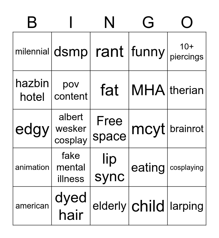 This bingo card has a free space and 24 words: fake mental illness, dyed hair, fat, american, 10+ piercings, milennial, hazbin hotel, dsmp, mcyt, lip sync, MHA, edgy, eating, cosplaying, pov content, child, brainrot, rant, therian, albert wesker cosplay, larping, animation, funny and elderly.