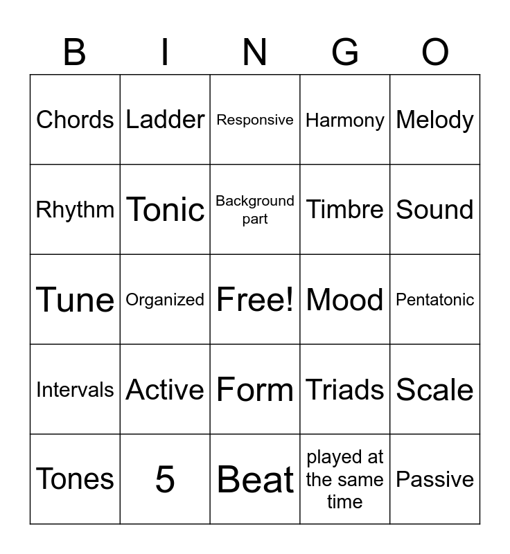 This bingo card has a free space and 24 words: Active, 5, Background part, Tones, Melody, Chords, Rhythm, Ladder, Mood, Form, Timbre, Tune, Triads, Scale, Tonic, played at the same time, Pentatonic, Responsive, Sound, Organized, Passive, Intervals, Harmony and Beat.