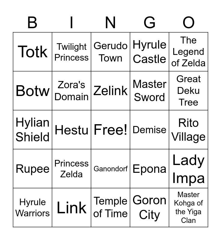 This bingo card has a free space and 24 words: Princess Zelda, Link, Zelink, Hyrule Warriors, The Legend of Zelda, Totk, Botw, Twilight Princess, Demise, Ganondorf, Master Sword, Hylian Shield, Epona, Lady Impa, Zora's Domain, Goron City, Rito Village, Gerudo Town, Great Deku Tree, Hestu, Master Kohga of the Yiga Clan, Rupee, Hyrule Castle and Temple of Time.