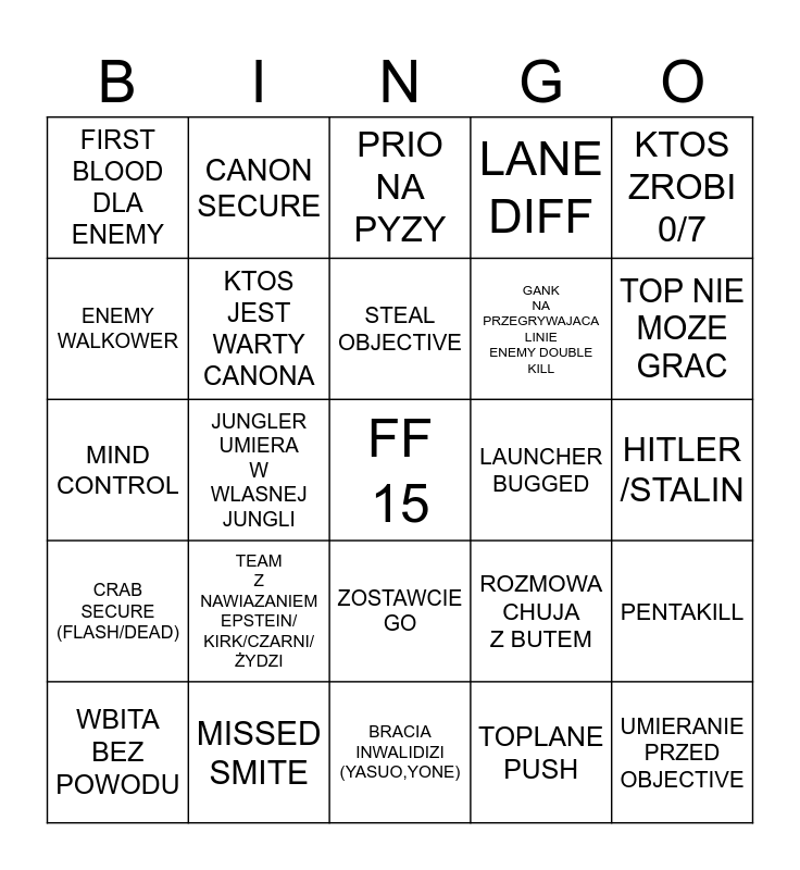 This bingo card has a free space and 24 words: TEAM Z NAWIAZANIEM EPSTEIN/ KIRK/CZARNI/ ŻYDZI, MISSED SMITE, STEAL OBJECTIVE, WBITA BEZ POWODU, KTOS ZROBI 0/7, FIRST BLOOD DLA ENEMY, ENEMY WALKOWER, CANON SECURE, LAUNCHER BUGGED, ZOSTAWCIE GO, GANK NA PRZEGRYWAJACA LINIE ENEMY DOUBLE KILL, MIND CONTROL, ROZMOWA CHUJA Z BUTEM, PENTAKILL, KTOS JEST WARTY CANONA, TOPLANE PUSH, HITLER /STALIN, PRIO NA PYZY, TOP NIE MOZE GRAC, JUNGLER UMIERA W WLASNEJ JUNGLI, UMIERANIE PRZED OBJECTIVE, CRAB SECURE (FLASH/DEAD), LANE DIFF and BRACIA INWALIDIZI (YASUO,YONE).
