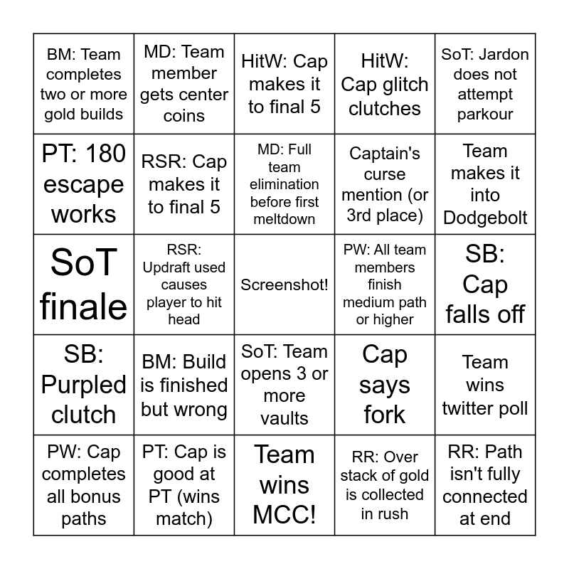 This bingo card has a free space and 24 words: BM: Build is finished but wrong, PT: Cap is good at PT (wins match), MD: Full team elimination before first meltdown, PW: Cap completes all bonus paths, SoT: Jardon does not attempt parkour, BM: Team completes two or more gold builds, PT: 180 escape works, MD: Team member gets center coins, PW: All team members finish medium path or higher, SoT: Team opens 3 or more vaults, Captain's curse mention (or 3rd place), SoT finale, Cap says fork, Team wins twitter poll, RSR: Cap makes it to final 5, RR: Over stack of gold is collected in rush, SB: Cap falls off, HitW: Cap makes it to final 5, Team makes it into Dodgebolt, RSR: Updraft used causes player to hit head, RR: Path isn't fully connected at end, SB: Purpled clutch, HitW: Cap glitch clutches and Team wins MCC!.