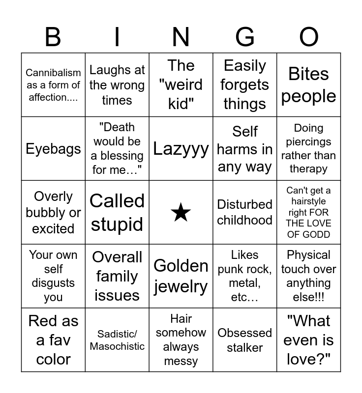 This bingo card has a free space and 24 words: Red as a fav color, Overall family issues, Lazyyy, Obsessed stalker, Bites people, Cannibalism as a form of affection...., Laughs at the wrong times, The "weird kid", Disturbed childhood, Can't get a hairstyle right FOR THE LOVE OF GODD, Overly bubbly or excited, "Death would be a blessing for me…", Likes punk rock, metal, etc…, Physical touch over anything else!!!, Eyebags, Sadistic/ Masochistic, Hair somehow always messy, Easily forgets things, Doing piercings rather than therapy, Your own self disgusts you, Called stupid, Golden jewelry, Self harms in any way and "What even is love?".